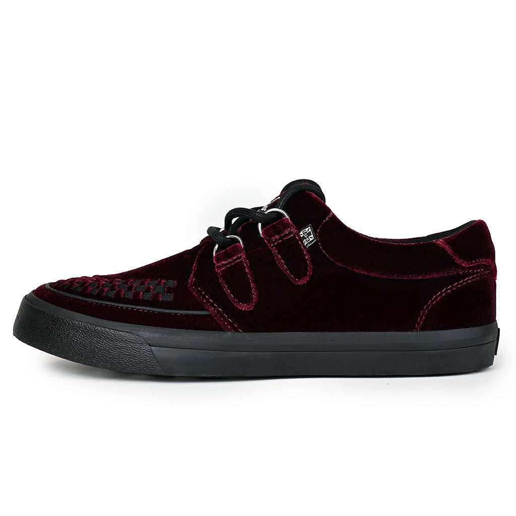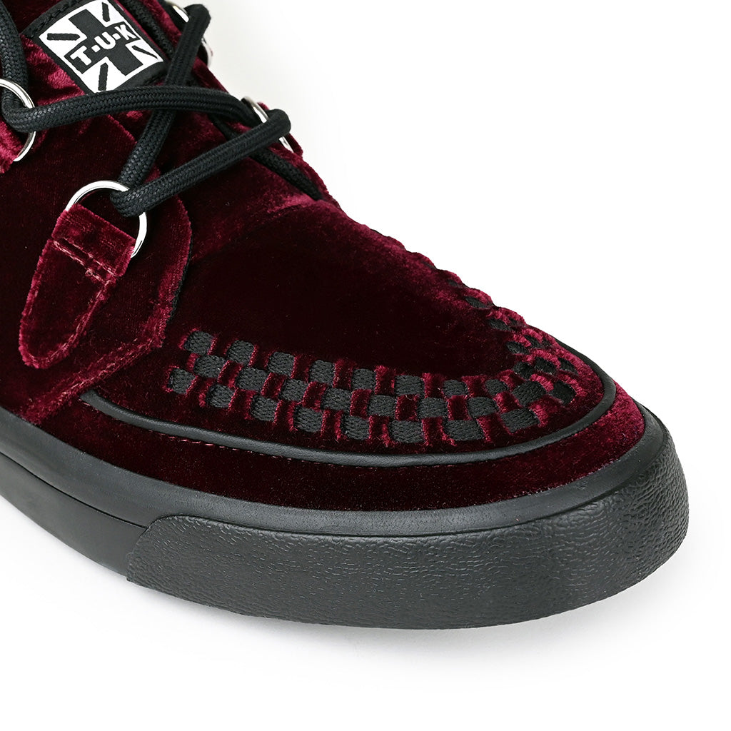 Vegan burgundy velvet with black interlace creeper sneaker. With memory foam insole, skull & bones tread and steel D-ring laces. Vegan and PETA approved.